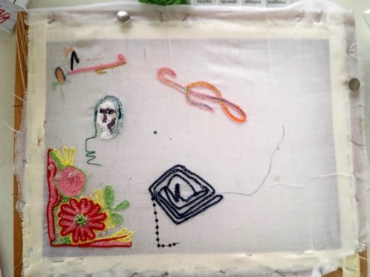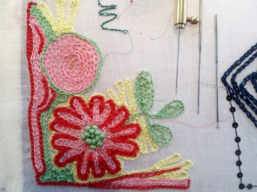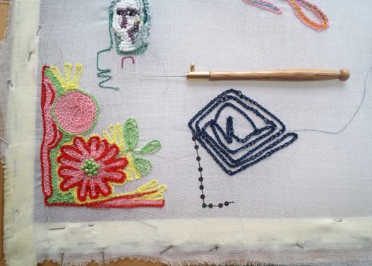 Links auf dem Tisch seht ihr ein Stück liegen, das ich schon vorher mit der Hand bestickt hatte – das dauerte ebenso lang wie mit der Tambournadel und war befriedigender, weil es störungsfreier voranging.
