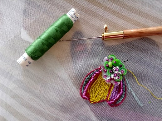 Ja, diese Kantan-Tambour-Fangnadel müsste man auch mal probieren, ich wollte es ja eigentlich wie die Profis in den Videos schaffen. Wenn man recherchiert, findet man viele, je nach Land/Webseite unterschiedlich verstandene Begriffe, Tambour, Luneville, Kantan, Ari/Aari, Zari, Zardosi… , aber das Grundprinzip mit dem Kettenstich haben sie gemeinsam.