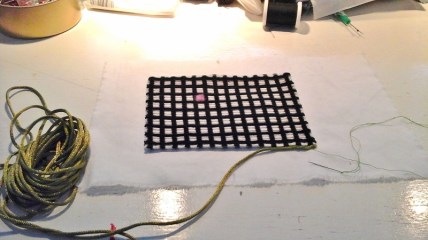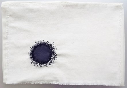 Dieses bestickte Stück überzeugt mich noch nicht, etwas fehlt. (Der Kreis war ein Stück Flicken für eine Barbour-Jacke, riecht ziemlich streng nach Wachs – unfotografierbar).