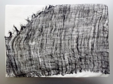 Sieht das nicht ein bisschen aus wie gezeichnet? Mit schwarzem Stift schraffiert? Ist aber ein Gewebe, ein Rest Netz, auf Nessel appliziert. Das schwarze Schleierstück stammt aus einem alten Kleiderkoffer.