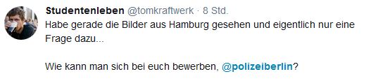 Damit haben wir den Kreis geschlossen zu den Berliner Hundertschaften. (Die im übrigen nach ihrer Rückkehr in die Heimat gar nicht blau machen konnten, sondern gleich wieder gefordert waren – wegen eines Stromausfalls in einem Stadtteil.)