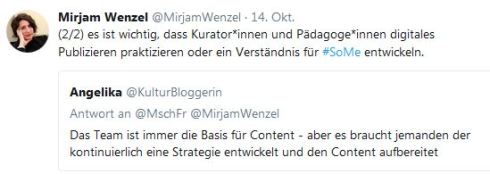 Macht das nur, wenn ihr das wirklich lebt! Klar könnt ihr eure Mitarbeiter dafür zu Schulungen schicken, aber nur wer wirklich Teil einer Community ist, kann „in echt“ mitspielen. Mein Lieblingsbeispiel ist bei Twitter Timothy Long vom Museum of London. Der ist super. Dazu gehört aber auch eine Leitungsebene, die ihn machen lässt!