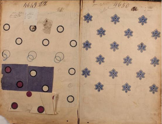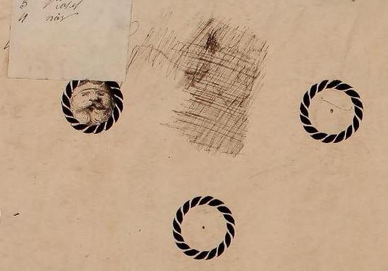 In einem französischen Stoffmusterbuch von 1863 hat jemand herumgekritzelt, vielleicht aus Langeweile. Das ist doch ganz klar ein Nikolaus, oder?