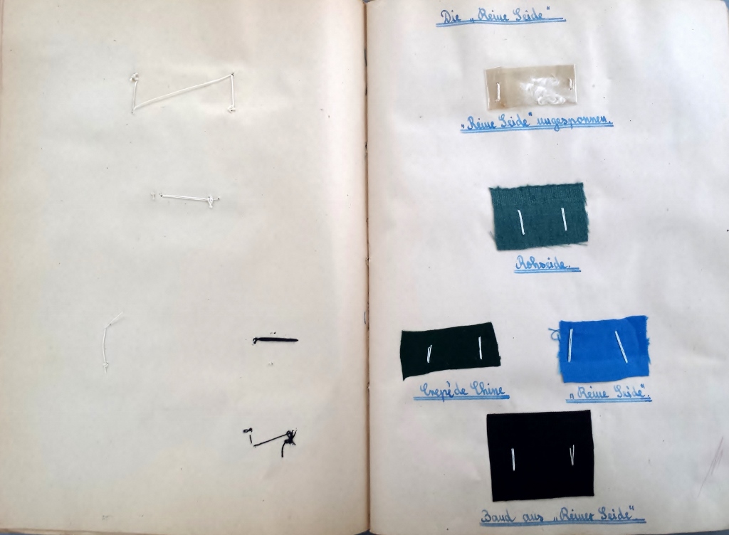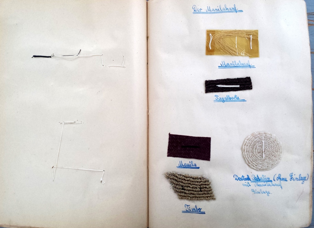 Seht mal was für ein schönes Weihnachtsgeschenke ich bekommen habe. Dieses alte Schulheft einer Hamburger Mädchenschule ist ein Flohmarktfund und steckt voller Materialien. Ob Kaninchenhaar, Stroh, Schilf oder Seidensamt, die Schülerin Ingrid Wulf aus Klasse 6.3 hat fast 200 Stoff- und Bandproben eingenäht.