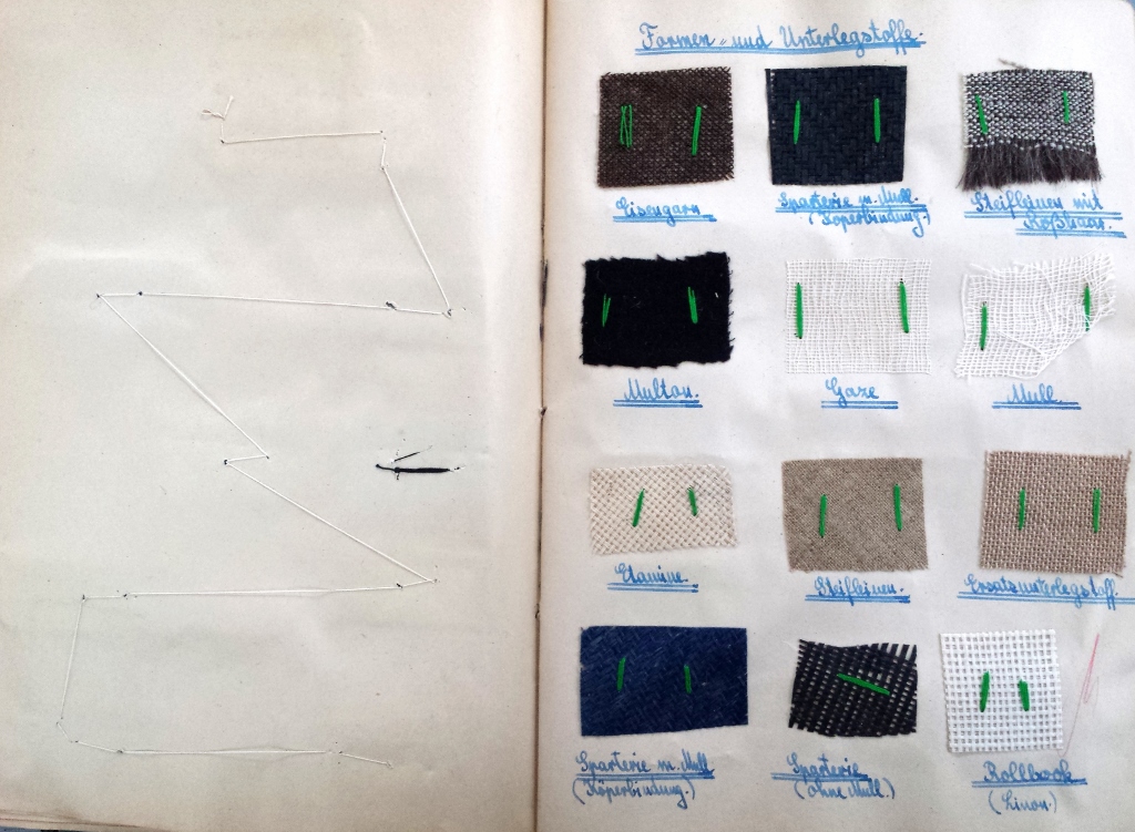 4. Ein interessanter Fund, und so spannend, wenn man sich näher damit beschäftigt! Ich denke auch, dass die Schrift auf Nachkriegszeit deutet. Ich fühlte mich ein wenig an meine eigene Schulzeit erinnert, ich hätte sicher auch Spaß daran gehabt, eine alte Mustersammlung aus irgendeinem Fundus neu einzusortieren. Ehrlich gesagt kann ich mir auch kaum vorstellen, dass eine Schülerin ihre Proben so wenig gleichmäßig befestigt hätte! Vielleicht handelt es sich ja um unterschiedliche Personen, die benannte Ingrid und diejenige die die Blätter gearbeitet hat? Tochter einer Modistin vielleicht? Sehr inspirierend, das alles!