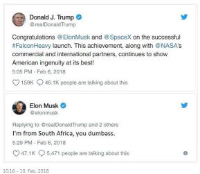 Aber nix da, hätte ich nur kurz auf die Antworten gleich unter dem Tweet geschaut, hätte ich gesehen: Das war nur ein Fake, in Wirklichkeit hat Elon Musk sich brav beim Präsidenten bedankt. Ich ärgere mich sehr, dass ich nicht wachsam war. Schließlich sammle ich hier doch regelmäßig Falschmeldungen und sollte es besser wissen. (2016: Alles falsch – kleine textile Hoaxsammlung und 2017: Falschmeldungen ein Jahr später – Hoaxsammlung II.)