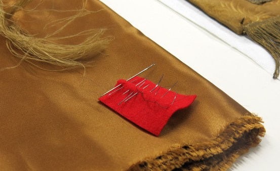 Damit das wertvolle Textil beim Nähen möglichst flach liegen bleiben kann, wird mit gebogenen Nähnadeln aus dem Chirurgenbedarf gearbeitet.