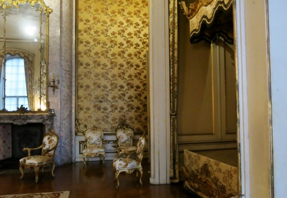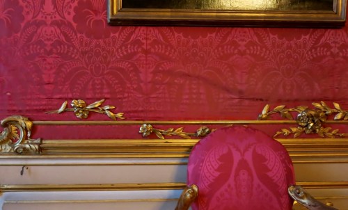 Im Damenschlafzimmer sind Stoffe aus drei Epochen zu sehen: Am Bett rechts noch original barocke Teile des Seidenatlas von 1769. Die Wand bedeckt eine Kopie von 1900, die Sessel sind mit einer neuen Version des Stoffes aus den 1950er Jahren bezogen.