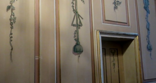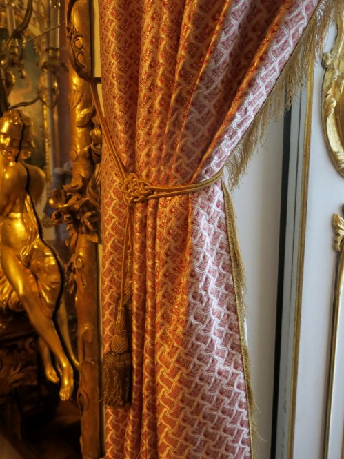 Aber wir waren ja wegen der Seiden da, der Seiden aus preußischer Produktion. Friedrich der Große gab sich große Mühe, den Franzosen Konkurrenz zu machen und in Preußen eine eigene florierende Seidenproduktion zu etablieren. Er vergab viele Aufträge und schaffte günstige Bedingungen, damit sich Textilfachleute aus anderen Regionen in Preußen ansiedelten. Die seidenbespannten Gästewohnungen im Neuen Palais mit ihren imposanten Goldborten und Posamenten waren eine Art Showroom für die landeseigenen Fabrikate.