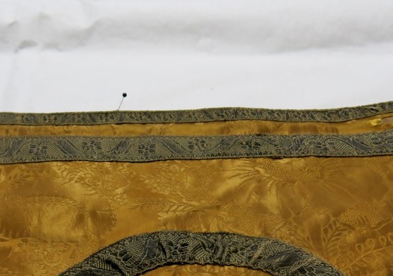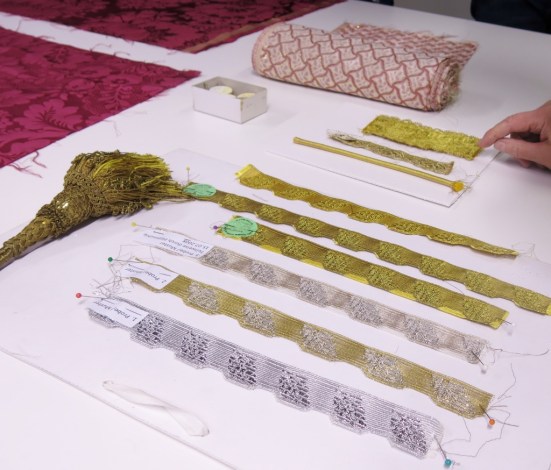 Für neue Borten und Tressen braucht es viele Versuche, bis die Metallfarbe ungefähr zur Patina des Originals passt.