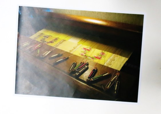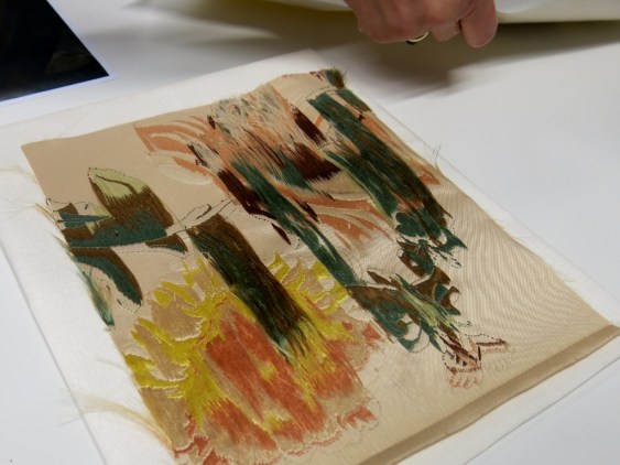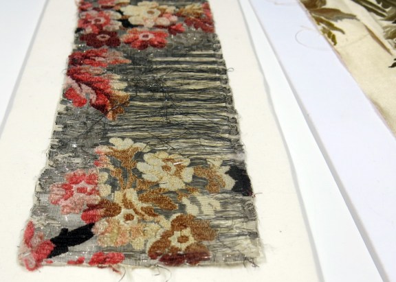 Manchmal war ein heute bräunlich wirkender Stoff früher in Wirklichkeit pink. Auf diesem silbrigen Stück zum Beispiel haben die vermeintlich braunen Blumen unter einer Abdeckung ihre ursprünglich rötliche Farbe behalten.