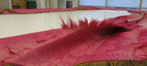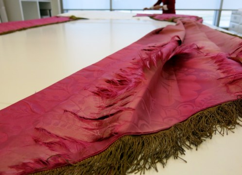 Die schüttere Seide aus der Zeit Friedrichs des Großen musste sehr aufwändig restauriert und auf einen Trägerstoff aufgebracht werden. Die Tressen sollten dabei möglichst unangetastet bleiben.