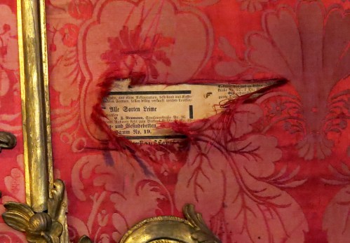 Der rote Damast, eine originalgetreue Kopie aus dem 19. Jahrhundert, zeigt an der Wand Alterungsspuren. Ein Riss legt das Darunter frei, eine vergilbte Zeitung.