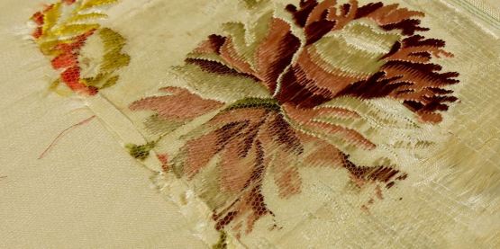 Bei solch einem broschierten Atlas entstehen die Blumenmuster dadurch, dass beimWeben bunte Seidenfäden punktuell eingearbeitet werden. Auf der Rückseite erscheinen die mitgeführten Fäden.