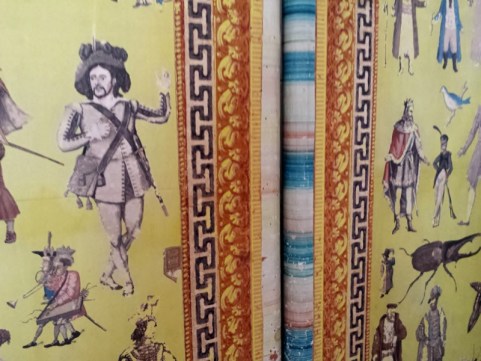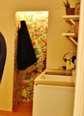 Die Muster der Papiertapeten liegen ziemlich im Trend, vielleicht könnte man davon Rollen verkaufen? Zum Beispiel für so eine Garderobennische: