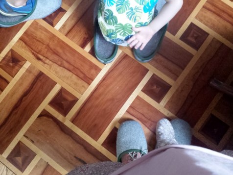 Die hübschen mit Flamingo- und Blattmotiven versehen Pralinenboxen der Firma Lauenstein gehen im KaDeWe weg wie nix, trotz des stolzen Preises von 10 Euro für 10 kleine Pralinen. Das liegt an dem trendigen Look, bin ich mir sicher. (Beweis für den Trend: Man beachte das T-Shirt des Kindes oben beim Filzpantoffelfoto.)