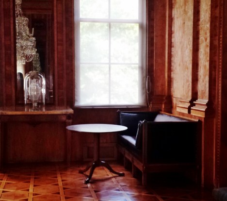 Im Kulissenschloss gibt es aber tatsächlich Räume zu besichtigen, Räume die seit der Zeit Königin Luises unverändert geblieben sind. Um diese Seltenheit zu sehen muss man jetzt schnell hin, denn ab dem 20. August 2018 wird das Gebäude zur Restaurierung für unbestimmte Zeit geschlossen. Durch die abgeschiedene Lage auf der Insel blieb die Innenausstattung mehr als 200 Jahre von Zerstörungen, Plünderungen und Renovierungen verschont, nur der Zahn der Zeit hat ihr zugesetzt. Alles hat so einen morbiden Charme, dass ein Besucher auf Tripadvisor schrieb: „Bretterbude mit rostiger Tapete…muss man gesehen haben“. Ein anderer beklagt den „völlig heruntergekommenen Zustand“. Mir war schon lange klar, genau das muss ich noch einmal sehen. Heruntergekommener Zustand, rostige Patina, alles original – genau mein Ding.