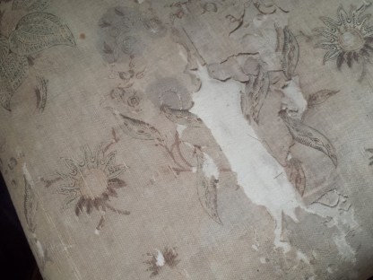 Erst auf dem Foto habe ich gesehen, dass ein Tüllnetz die Stofffetzen auf dem Polster sichert. Wenn ihr auf das Bild klickt, könnt ihr es erahnen. (Mehr zu solchen Restaurierungstechniken auch beim Beitrag über die Preußischen Seiden.)