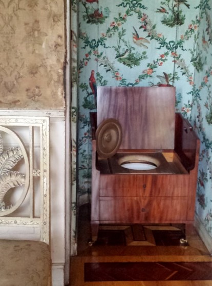 Wie wäre es nun, statt der ewig gleichen Servietten, Halstücher und Untersetzer in den Schlössershops vielleicht einmal Pralinenschachteln mit den Mustern der Papiertapeten zu vertreiben, vielleicht sogar mit der von Königin Luises Abtritt? Das wäre schön schräg, mir würde es gefallen ;)