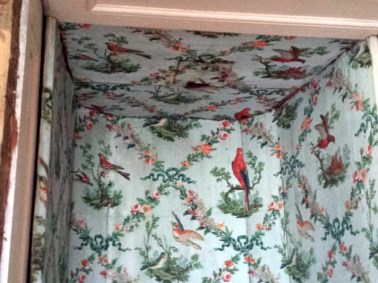 Die Zimmer des Königspaars sind mit Stoff bespannt. Heute ist die „Zitztapete“ (Zitz = Chintz, eine gewachste, fest gewebte Baumwolle) bräunlich nachgedunkelt.