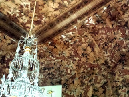 Der original erhaltene Kronleuchter harmonierte sicher schön mit den weißen Lackmöbeln und der einst noch in Rosa und Grün leuchtenden Wandbespannung.