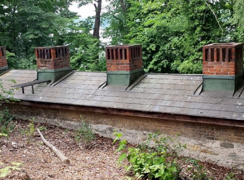 Nahe beim Schloss lag die Küche in den Abhang geschmiegt. Ob dies die Schornsteine dazu sind? Ich weiß es nicht sicher, der Weg dahin war gesperrt.