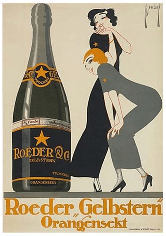 Eine Werbung von ca. 1914 für „Gelbstern“-Sekt, daneben zwei entzückte Damen, die jeweils einen gelben Stern auf dem Ärmel tragen.