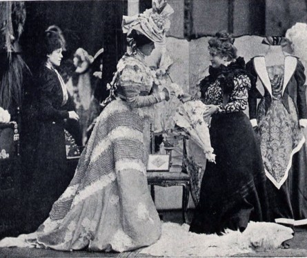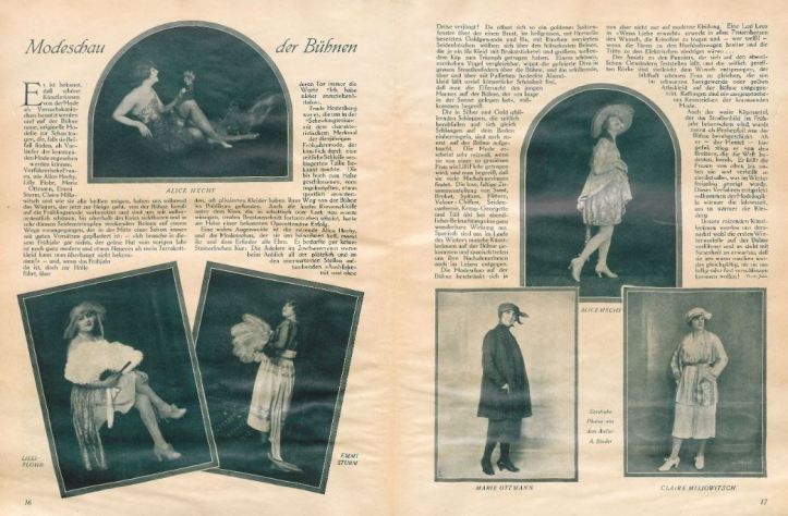 „Modeschau der Bühnen … es ist bekannt, daß schöne Künstlerinnen von der Mode als Versuchskaninchen benutzt werden und auf der Bühne neue, originelle Modelle zur Schau tragen, die, falls sie Beifall finden, als Vorläufer der kommenden Mode angesehen werden können.“