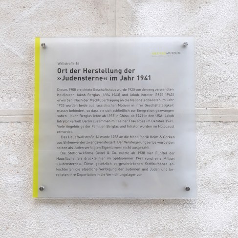 Und hier schließt sich am Ende dann doch der Kreis zur Berliner Modegeschichte, als der Gelbstern noch eine Probierdame war: Auch die Wallstraße 16 liegt im Viertel rund um den Hausvogteiplatz, wo bis 1930 die Berliner Konfektion der zweitwichtigste Wirtschaftszweig Berlins war. Das Gebäude gehörte vor der Zwangsversteigerung im Nationalsozialismus u.a. dem Textilunternehmer Jakob Berglas. Die Gedenktafel erinnert daran, dass die Familie Berglas wie die anderen Firmen jüdischer Kaufleute nach der Machtergreifung Betrieb, Eigentum und zum Teil auch ihr Leben verlor. Mehr dazu im Archiv der Berliner Zeitung anlässlich der Enthüllung des Gedenksteins.
