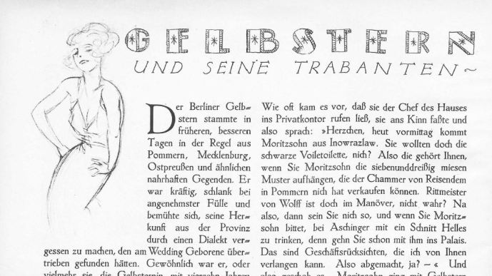 „Gelbstern“ war ein Begriff aus der Zeit vor dem ersten Weltkrieg. Später galt er als angestaubt und wurde nach und nach durch „Mannequin“ ersetzt. Die Sicht auf die Probierdame fasst dieses Stück aus aus Berliner Leben 1924 ganz gut zusammen:
