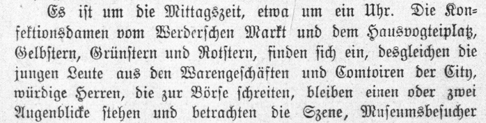 „Es ist um die Mittagszeit, etwa ein Uhr. Die Konfektionsdamen vom Werderschen Markt und dem Hausvogteiplatz, Gelbstern, Grünstern und Rotstern, finden sich ein, desgleichen die jungen Leute aus den Warengeschäften und Comtoiren der City …“ .