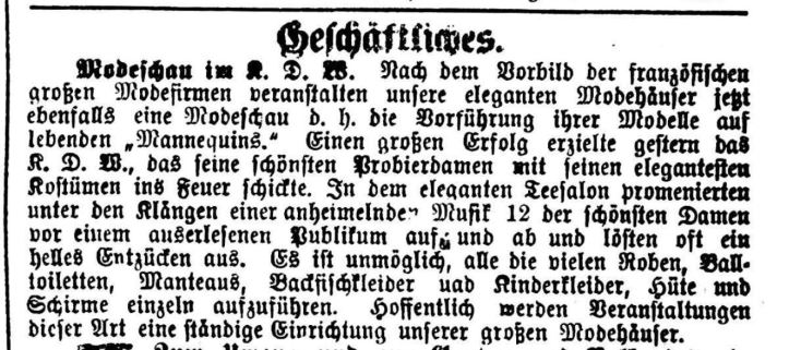 Eine richtige Modenschau wie wir sie kennen ist damals in Berlin noch eine Besonderheit. 1912 wird in der Zeitung vermeldet, dass im KaDeWe nach französischem Vorbild eine Vorführung der Modelle auf lebenden „Mannequins“ stattfand.