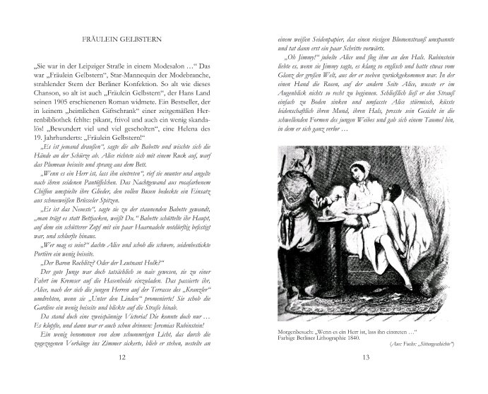 Brunhilde Dähn druckt dazu einige Seiten aus dem Kolportageroman „Fräulein Gelbstern“ (1905) von Hans Land ab und schreibt: „Ein Bestseller, der in keinem „heimlichen Giftschrank“ einer zeitgemäßen Herrenbibliothek fehlte: pikant, frivol und auch ein wenig skandalös!“